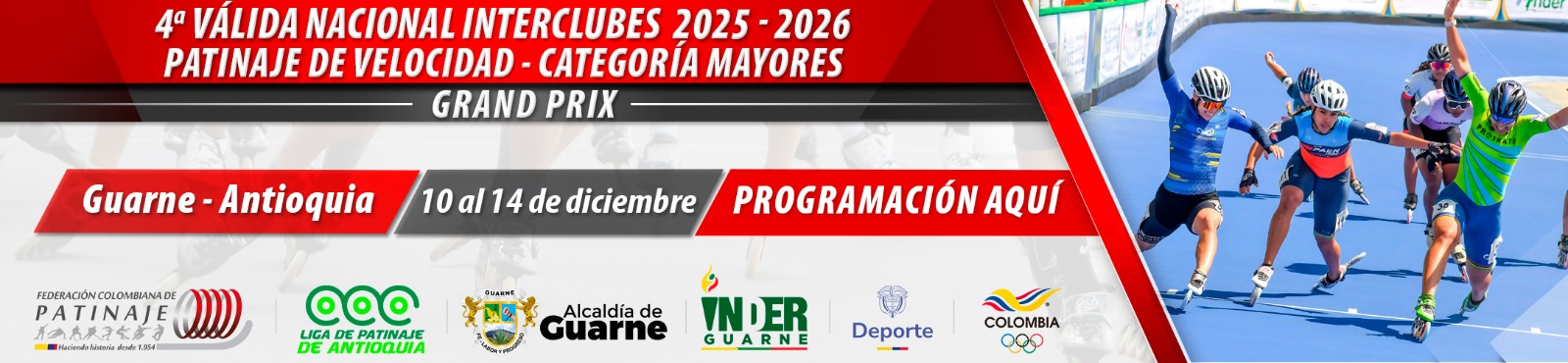 Por medio de la cual se convoca y reglamenta la CUARTA VÁLIDA NACIONAL PUNTUABLE INTERCLUBES 2026 EN LA DISCIPLINA DEPORTIVA DE PATINAJE DE VELOCIDAD CATEGORÍA MAYORES, para el proceso de conformación de Selecciones Nacionales a eventos internacionales en la temporada deportiva 2025- 2026, que se realizará en el marco del GRAND PRIX NACIONAL DE PATINAJE del día 10 AL 14 de diciembre de 2025, en la Ciudad de Guarne – Antioquía. |