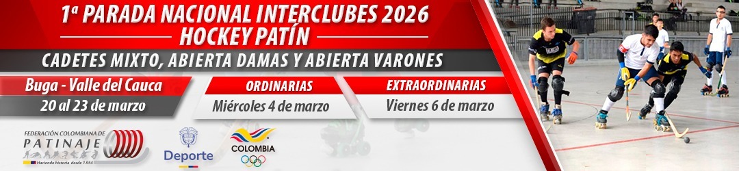 Por medio de la cual se convoca a la Primera Parada Nacional Interclubes de hockey patín, de la temporada 2026 para las categorías: cadetes mixto, abierta damas y abierta varones que se realizará en la ciudad de Buga, Valle del Cauca, del 20 al 23 de marzo de 2026. |