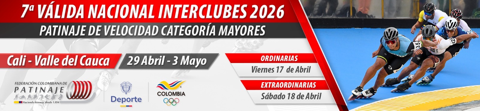 Por medio de la cual se convoca y reglamenta la SÉPTIMA VÁLIDA NACIONAL PUNTUABLE INTERCLUBES 2026 EN LA DISCIPLINA DEPORTIVA DE PATINAJE DE VELOCIDAD CATEGORÍA MAYORES, para el proceso de conformación de Selecciones Nacionales a eventos internacionales en la temporada deportiva 2025- 2026, que se realizará del día 29 de Abril al 3 de Mayo de 2026, en la Ciudad de Cali – Valle. |
