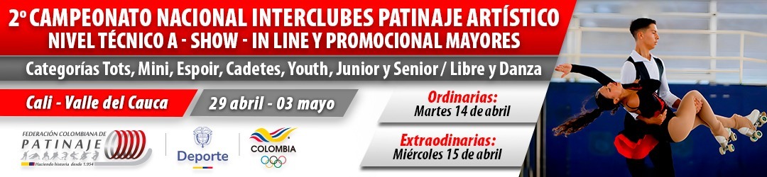 Por medio de la cual se convoca y reglamenta el II Campeonato Nacional Interclubes Nivel Técnico A, Show, In Line y Promocional Mayores, en las categorías Tots, Mini, Espoir, Cadetes, Youth, Junior y Senior, en las modalidades de: libre (individual y parejas), danza (individual y parejas), show (grupo pequeño y grande, cuarteto) e In Line, a realizarse en Cali, Valle del Cauca, del 29 de abril al 03 de mayo de 2026. |