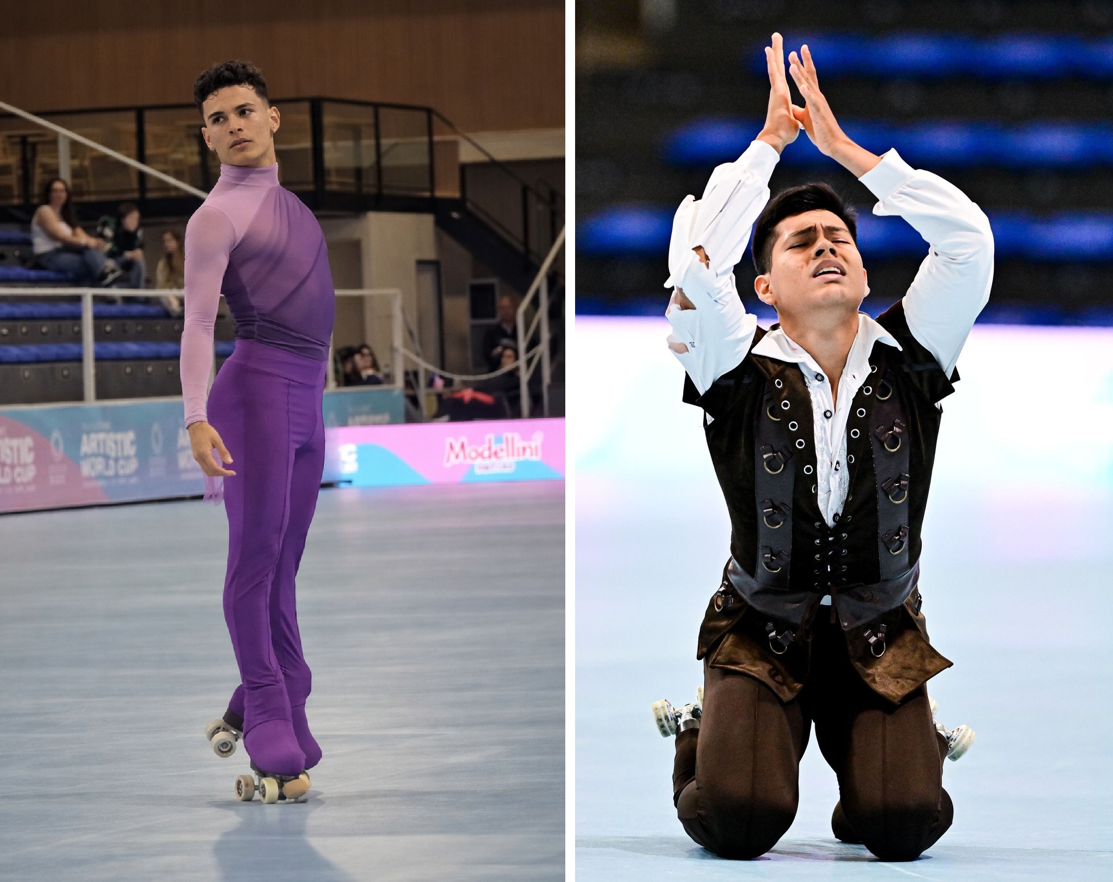 Los patinadores colombianos Brayan Carreño y Jeshua Folleco medalla de oro en la modalidad de solo danza, sénior y júnior, durante la primera fase de la Artistic World Cup, certamen que se disputa en el Pabellón Europa del Parque Olímpico de la Juventud, en Buenos Aires, Argentina.