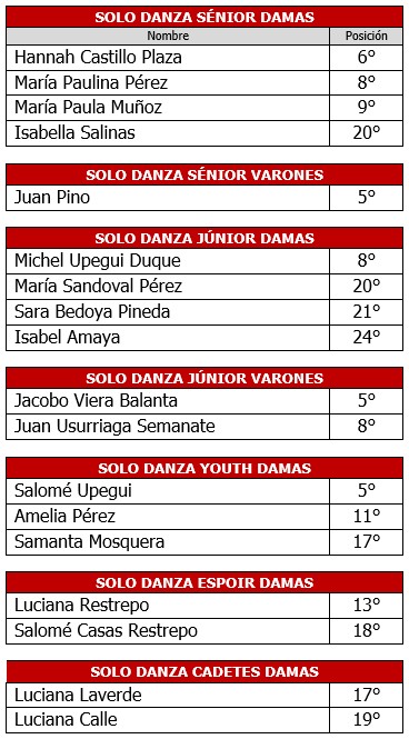 Por su parte, Jeshua Folleco, también campeón mundial, se quedó con la medalla de oro en solo danza júnior al registrar una puntuación de 144.42. El colombiano superó al italiano Luca Buonincontro, quien obtuvo la plata con 143.83, y al brasileño Felipe Tozatto, bronce con 135.57.