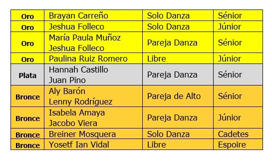 Previamente, la modalidad de pareja danza le había dado nuevas alegrías a Colombia. En la categoría sénior, María Paula Muñoz y Jeshua Folleco conquistaron la medalla de oro con 156.96 puntos, mientras que Hannah Castillo y Juan Pino se quedaron con la medalla de plata tras lograr 122.95. El bronce fue para los argentinos Melisa Abril y Luciano Prieto, con 108.40.