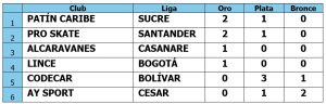 Al cierre del campeonato, los clubes Patín Caribe (Sucre) y Pro Skate (Santander) se destacaron como los más sobresalientes, obteniendo dos medallas de oro y una de plata cada uno.