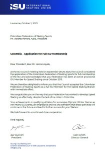En la reunión del Consejo de la ISU celebrada los días 28 y 29 de septiembre de 2025, el Consejo consideró la solicitud de la Federación Colombiana de Patinaje para ser miembro de pleno derecho de la ISU y reconoció que su federación ha sido miembro provisional activo de la ISU para Patinaje de Velocidad desde octubre de 2015.