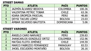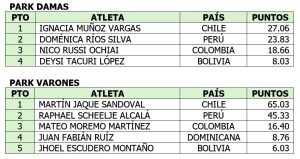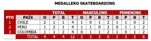 La delegación de Chile dominó el medallero, al ganar dos preseas doradas, el park damas con Ignacia Vargas Muñoz, y el park varones, donde el oro se lo llevó Martín Jaque Sandoval, mientras que Perú fue segundo al obtener un oro, con Ángelo Caro en street, y dos platas a través de Doménica Ríos Raphael Scheelje Alcalá, en la modalidad de park. Colombia se ubicó en el tercer lugar de este medallero.