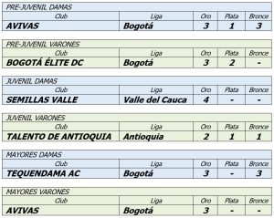 En las otras categorías, el Avivas de Bogotá ganó prejuvenil damas y mayores varones; en juvenil varones, el mejor club fue el Talentos de Antioquia y en mayores damas el Tequendama AC, de la mano de María Camila Vargas, quien ganó tres oros.