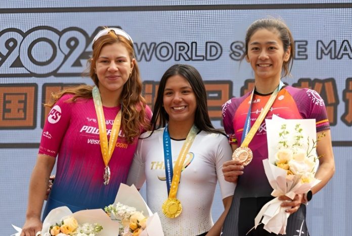 En la maratón femenina, y con una gran diferencia con respecto al grupo, llegarían a la línea de meta dos colombianas, cruzando primera la juvenil Valentina Cano, del Simmons Rana World Team, quien empleó 1 hora 13 minutos 49 segundos, superando por tan solo 89 milésimas de segundo a María José Quiroz, del Powerslide Vesmaco. La tercera posición le correspondió a Yi Hsuan Liu, de China Taipéi, patinadora al servicio del club Arena Geisingen, quien llegó con el grupo a casi cuatro minutos.