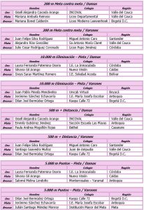 En las primeras jornadas se han destacado tres deportistas. Ellos han ganado de a dos medallas de oro: la campeona mundial Gisell Alejandra Caicedo, corriendo por el Incoval del Valle del Cauca; Luysa Fernanda Paternina de la Institución Educativa La Inmaculada de Córdoba; y Juan Felipe Silva del Colegio Miguel Antonio Caro de Santander.