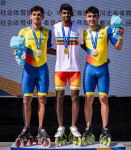 La carrera de 42 kilómetros masculina terminó con un cerrado duelo en el que el representante de India, Anandkumar Velkumar, hizo historia en el patinaje mundial al ser el primer representante de este país en ganar una maratón. Velkumar sorprendió a los colombianos Lenis y Mantilla y los venció en la línea de sentencia tras 58 minutos, 29 segundos y 747 milésimas de competencia.
